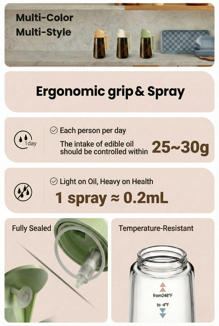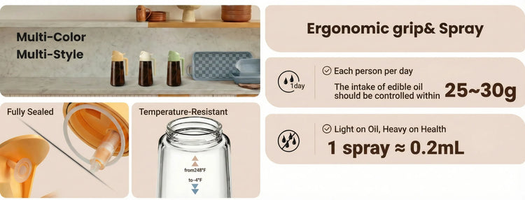 Mit einem milden Reinigungsmittel waschen und mit warmem Wasser ausspülen. Den Sprühkopf mehrmals betätigen, um restliches Wasser zu entfernen, und anschließend an der Luft trocknen lassen, bevor Sie das Gerät wieder zusammenbauen. So bleibt die Funktionsfähigkeit Ihres Olivenölsprühers beim Kochen erhalten.