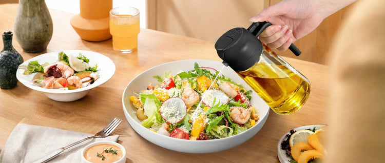 Materiales premium y seguros: Fabricados con polipropileno apto para uso alimentario, libre de BPA y vidrio engrosado sin plomo. Las botellas transparentes y verdes ayudan a controlar los niveles de aceite y a proteger la frescura.