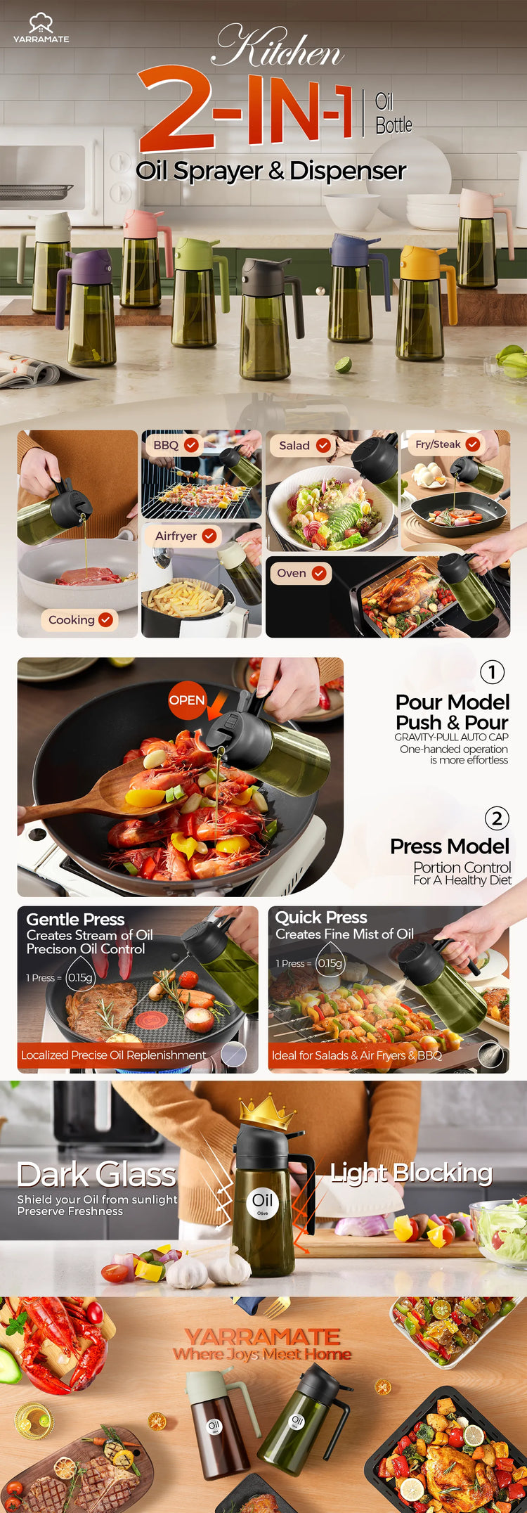 | Versatile 2-in-1 Design | This 2 in 1 glass oil sprayer and oil olive dispenser is crafted for both spraying and pouring, perfect for dressing salads, grilling, and other kitchen tasks. Sprays & pours oil easily. |